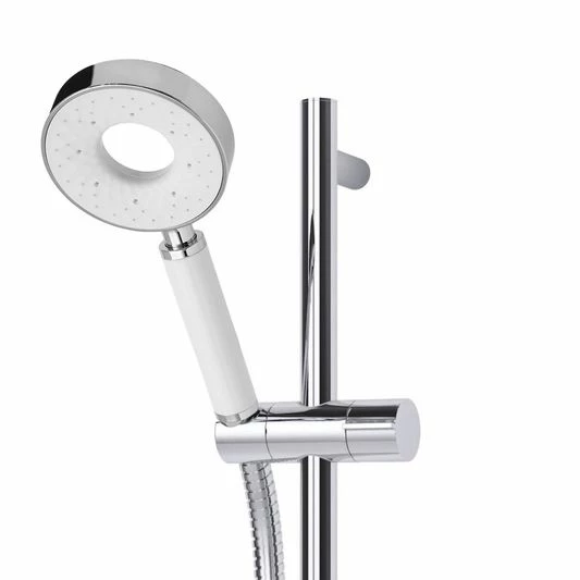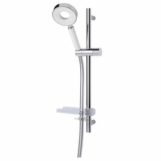 The Kian shower kit is slender styled with discreet brackets, so itβs ideal when a minimal style is desired, complemented by a statement white/chrome finish single spray pattern Iris shower head. Easy installation is provided with the pre-assembled rail, brackets, hose retainer and slider. An optional clip on tray is also provided.